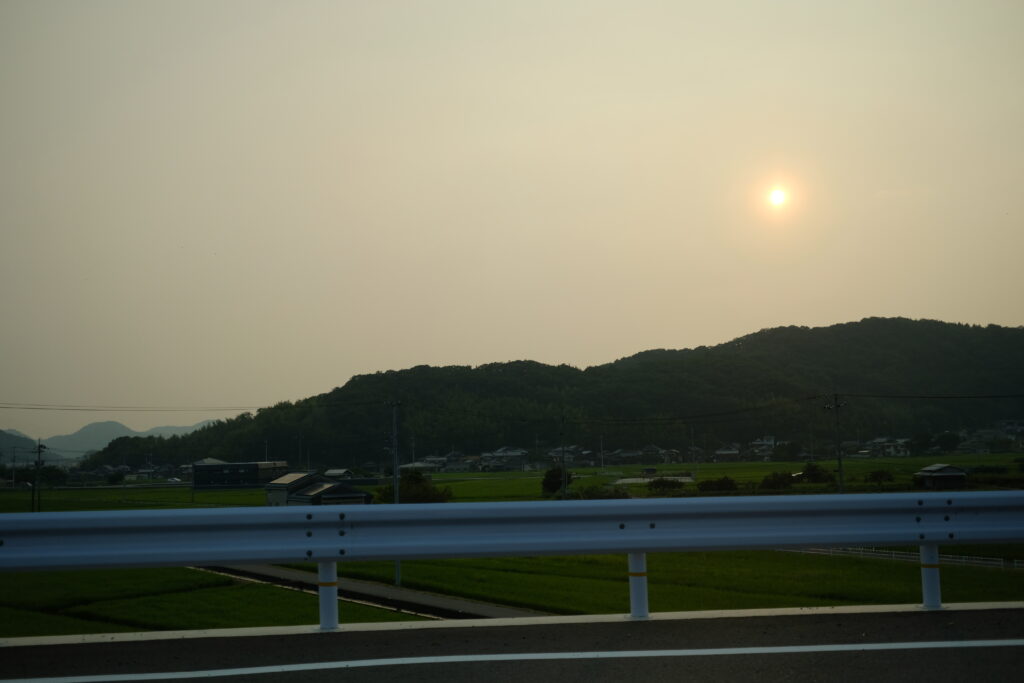 8月26日、火曜日。今日は美作から直島への移動日。夕方に湯郷温泉を出発したんだけど、宇野の港に着くまでずっと空が霞んでいて、妙な雰囲気でした。陽で熱せられたところに雨が降って、蒸気にでもなったのかな。