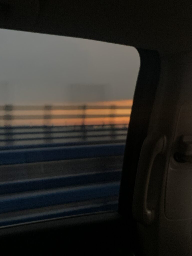 夕日が赤くて情熱的だった。「写真撮りたいだろう?夕日を綺麗に撮って。」と言われた、移動している車の中。