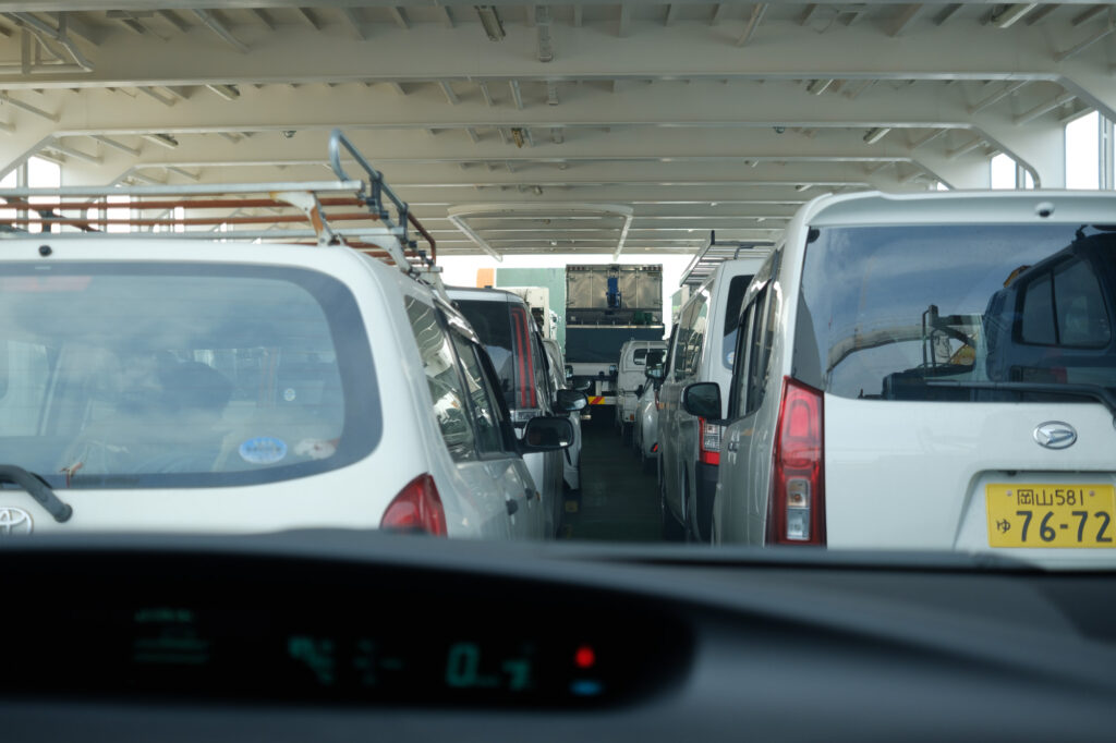 本日は美作への移動日。島内はどこもメンテナンス中で、工事車両が多い為かフェリーもパンパン。乗ったはいいけど車から降りられない。