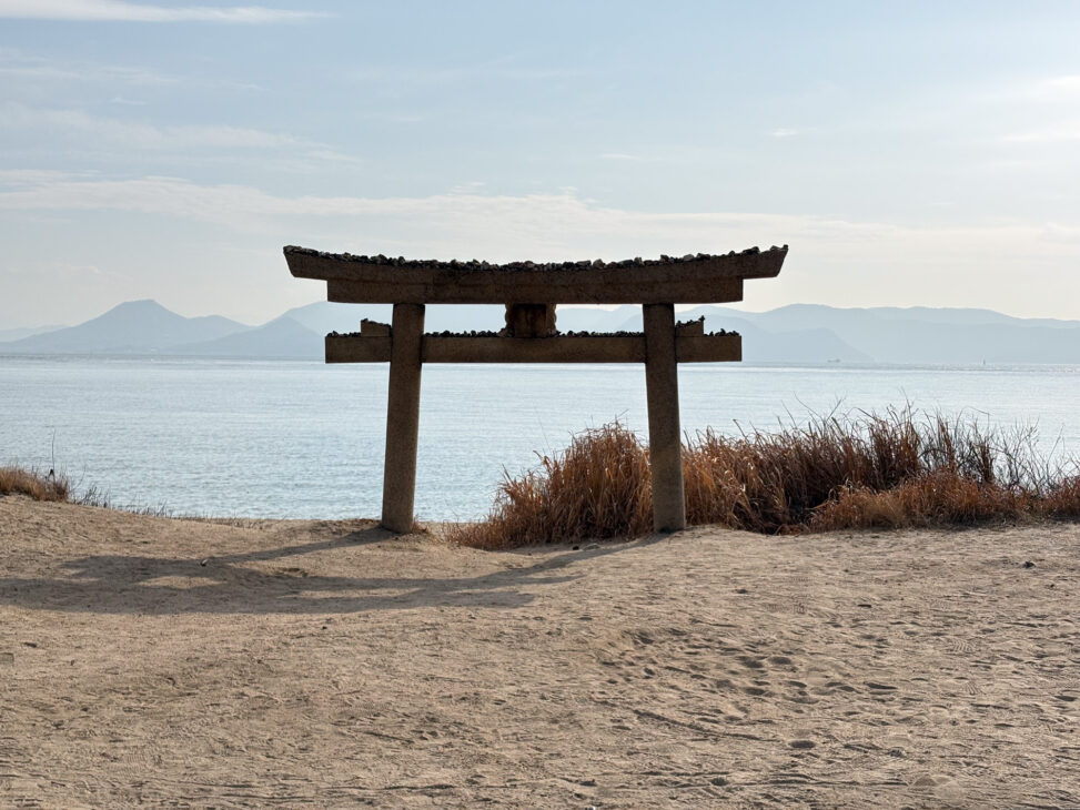 仕事。今日もお客様の送迎で外に出る事が多かった。上の写真は琴弾地海水浴場にある「恵美須神社の鳥居」。鳥居の足は砂に埋まっていて、露出している部分は僕の背丈ほど。鳥居は石を乗せると願いが叶うという事で、かなりの石が積まれています。